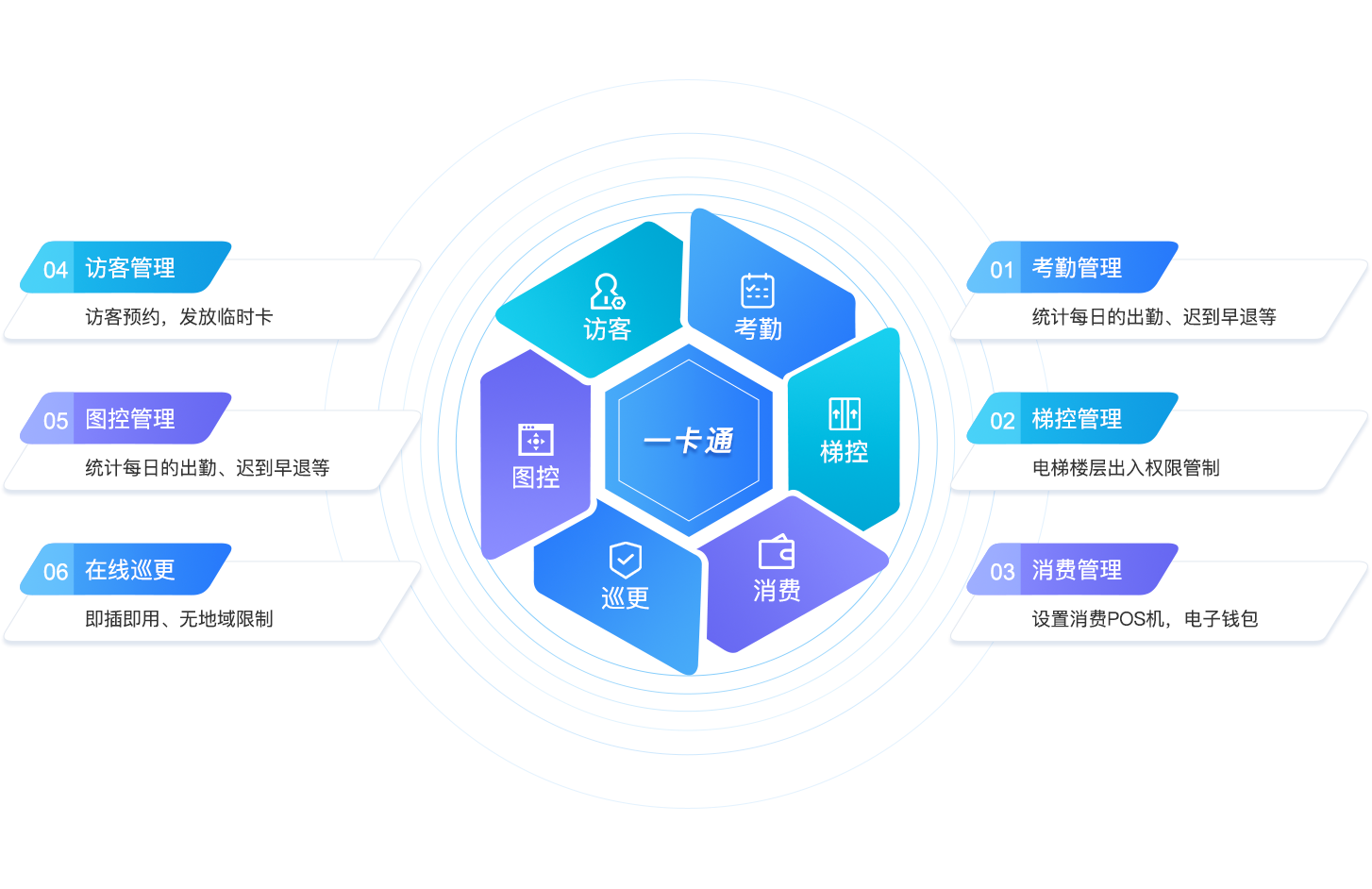 系統(tǒng)采用非接觸式IC卡,利用多種門禁方式(單向刷卡、雙向刷卡、生物識(shí)別+門鎖等),對(duì)使用者授予不同的進(jìn)出權(quán)限,進(jìn)行多級(jí)控制;同時(shí)對(duì)特定對(duì)門及通道設(shè)置特殊管制(雙向刷卡、生物識(shí)別等)。